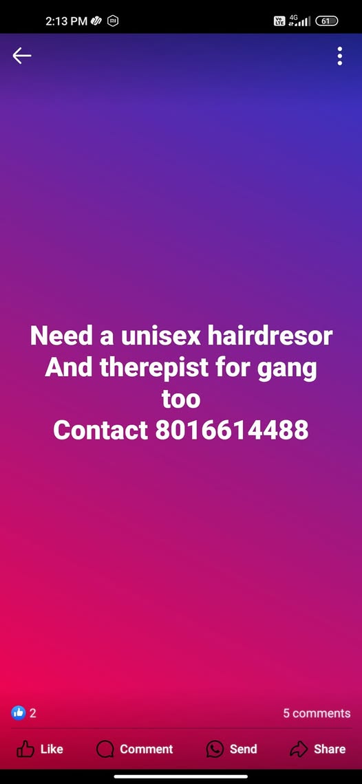 May be a graphic of phone and text that says ‘2:13 PM 2:13 ผป็ก LE Paill 61 Need a unisex hairdresor And therepist for gang too Contact 8016614488 Like 5 5comments Comment Send Share’ contact name: Da Yangs contact number: 8016614488