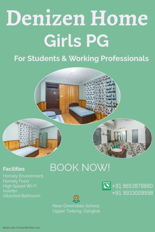 071224_38 May be an image of text that says “Denizen Home Girls PG For Students & Working Professionals HanH Facilities Homely Environment Homely Food High Speed Wi-Fi Inverter Attached Bathroom NOW! +918653878880 +91 8653878880 +91 9933009998 Near Greendale School. Upper Tadong. Gangtok Made MadewithPosterMyWal.com with PosterMyWall.com” contact name: Ashish Gurung contact number: 8653878880