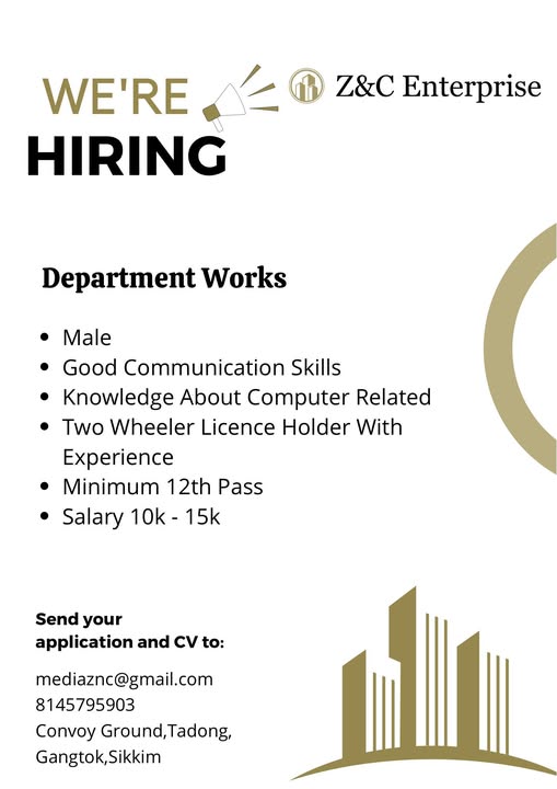 071224_179 May be a graphic of text that says ‘WE’RE HIRING Z&C Enterprise Department Works Male Good Communication Skills Knowledge About Computer Related Two Wheeler Licence Holder With With Experience Minimum 12th Pass Salary 10k- 10k-15k 15k Send your application and CV to: mediaznc@gmail.com 8145795903 Convoy Ground, Ground,Tadong, Tadong, Gangtok,Sikkim’ contact name: Susmita Rai contact number: 8145795903