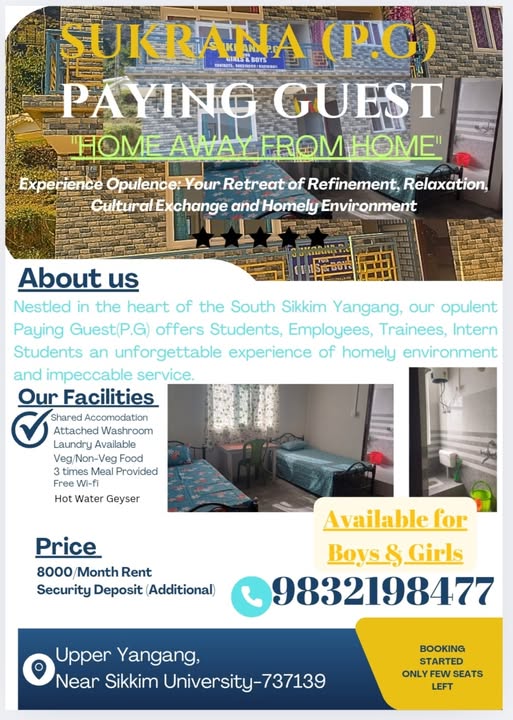 071224_149 May be an image of text that says ‘SUKRANA (ዋ.) PAYING GUEST HOMEAWAYFROMHOME” HOMEAW AWA FROMHOME Experience Opulence:Y Your Retreat of Refinement, Relaxation, Culturali Exchange and Homely Environment About us Nestled in the heart of the South Sikkim Yangang, our opulent Paying Guest(P.G) offers Students, Employees, Trainees, Intern Students an unforgettable experience of homely environment and impeccable service. Our Facilities Shared Accomodation Attached Washroom Laundry Available Veg Non-Veg Food times Meal Provided Free Wi-fi Hot Water Geyser Price 8000 Month Rent Security Deposit (Additional) Availablefor for Boys& Girls 9832198477 Upper Yangang, Near Sikkim University 737139 BOOKING STARTED ONLYFEWS ONLY FEW SEATS LEFT’ contact name: Anonymous participant contact number: 9832198477