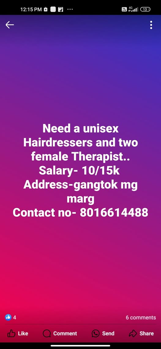 May be an image of text that says ’12:15PM + PM f LSS Need a unisex Hairdressers and andtwo two female Therapist.. Salary- 10/15k Address-gangtok mg marg Contact no- 8016614488 Like 6 6comments Comment Send Share’