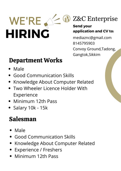 071224_124 May be a graphic of text that says “WE’RE HIRING Z&C Enterprise Send your application and CV to: mediaznc@gmail.com 8145795903 Convoy Ground, Ground,Tadong, Gangtok,Sikkim Department Works Male Good Communication Skills •Knowledge. About Computer Related Two Wheeler Licence Holder With Experience Minimum 12th Pass Salary 10k- 15k Salesman •Male Good Communication Skills Knowledge About Computer Related Experience Freshers Minimum 12th Pass” contact name: Susmita Rai contact number: 8145795903
